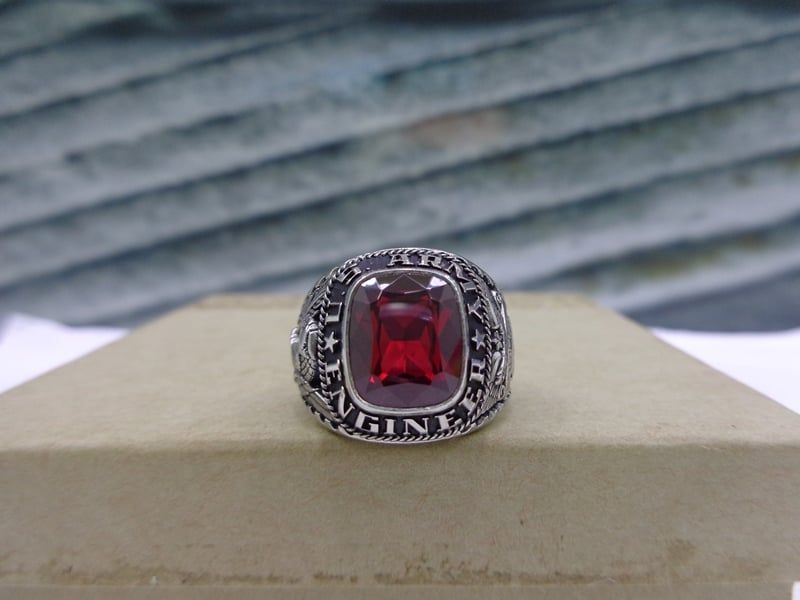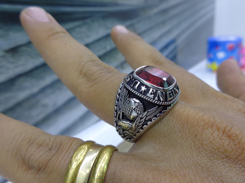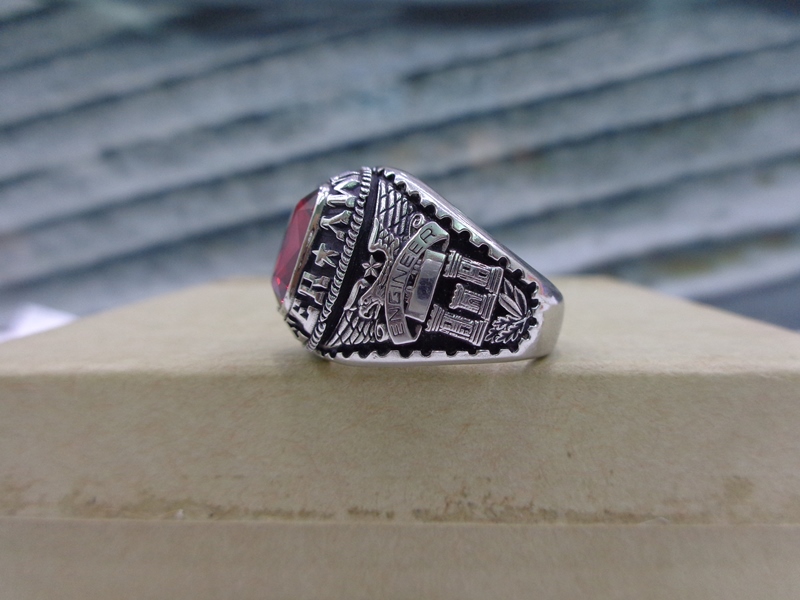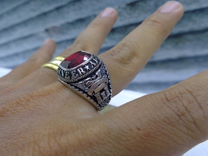 Nhẫn Mỹ Quân Đội Engineer– Trên cùng là hột đỏ màu Ruby với bề mặt và đáy mài đa giác long lanh, Bao quanh hột là dòng chữ US Army Engineer– Bên hông trái nhẫn...