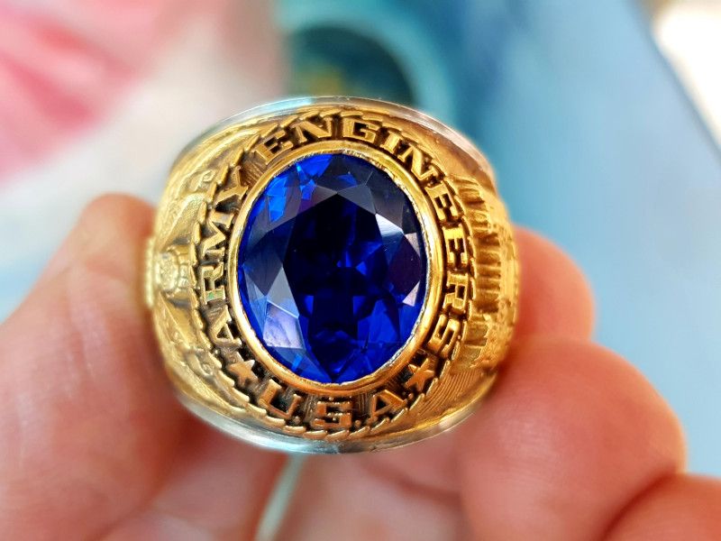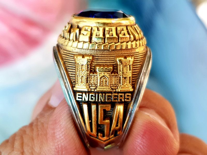 – Trên cùng là hột đỏ màu xanh Saphire với bề mặt và đáy mài đa giác long lanh, Bao quanh hột là dòng chữ US Army Engineer. (Kỹ Sư Quân Đội Hoa Kỳ)