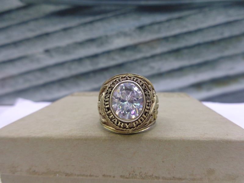 – Trên cùng là hột màu trắng Topal với bề mặt và đáy mài đa giác rực lửa, trắng như bông bưởi, tựa viên xoàn 10ly. Bao quanh hột là dòng chữ U.S ARMY Military Police