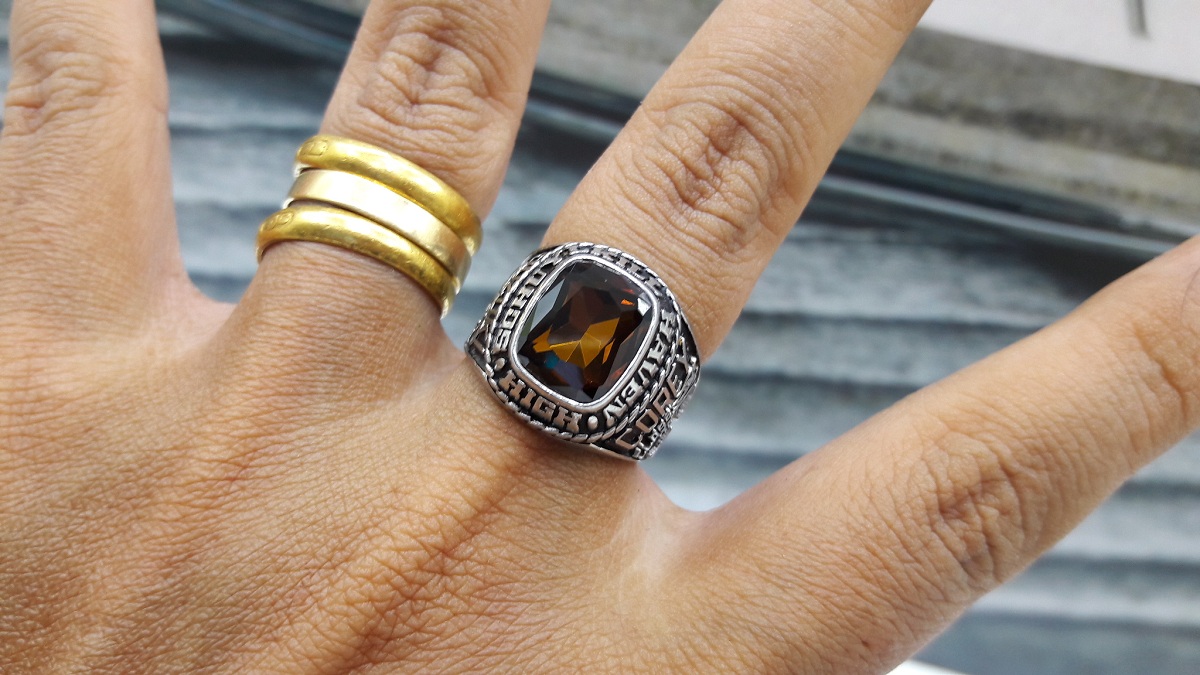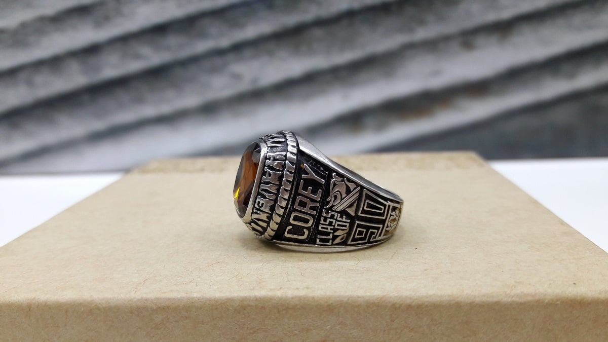 Nhẫn Mỹ Trường Học 1990Trên cùng là hột vuông vát cạnh màu vàng hổ phách long lanh , bao quanh hột là tên trường Schuylkill Haven Highschool.- Bên hông phải được khắc năm tốt nghiệp...