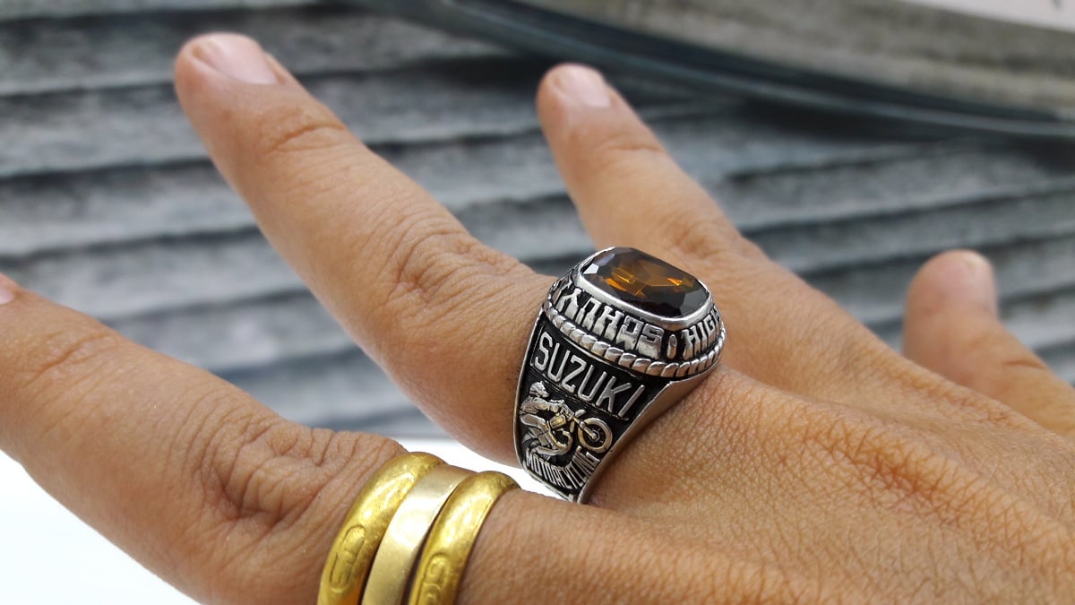 - Bên hông trái là hình ảnh tay xế mô-tô cực chất cùng một số họa tiết sắc xảo. Ai yêu Suzuki sẽ không thể bỏ qua chiếc nhẫn này.
