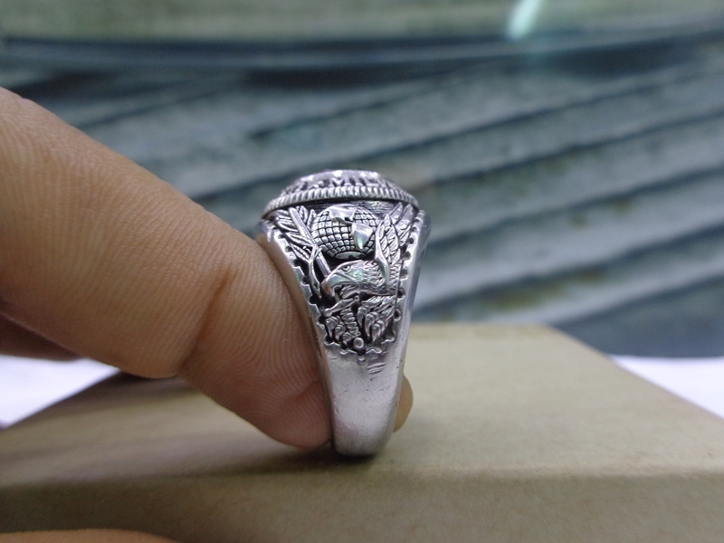 – Bên hông trái nhẫn khắc họa hình ảnh đại bàng gắp kiếm siêu siêu nét trước quả địa cầu với hình bản đồ Hoa Kỳ.