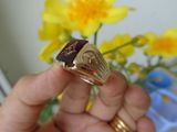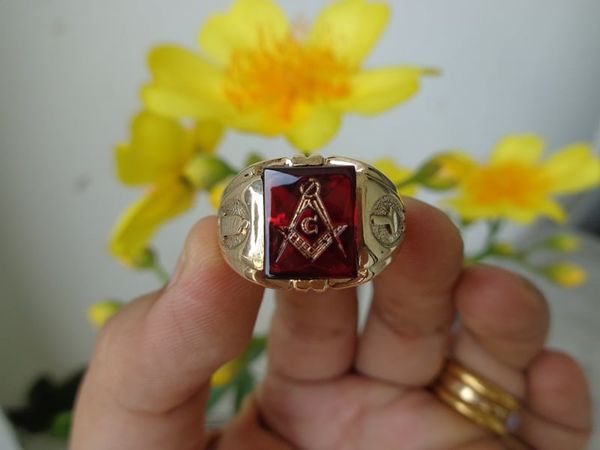 Nhẫn Mỹ Vàng 10K Masonic- Thiết kế nhẫn rất sáng tài với đá màu đỏ ruby và công nghệ chạm khắc lên hột họa tiết đặc trưng Masonic, Hột form vuông thiết kế đơn giản...
