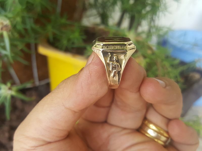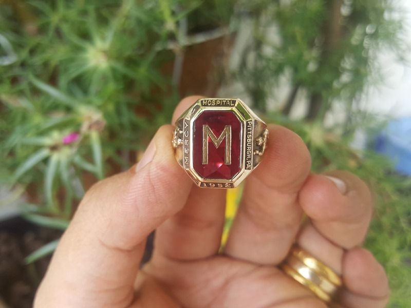 Nhẫn Mỹ Vàng 10K Năm 1952Trên cùng là hột màu đỏ ruby trơn láng, chính giữa hột khắc chữ "M" phủ vàng 10K , bao quanh hột là tên bệnh viện Mercy Hospital, Pittsburgh,PA và...