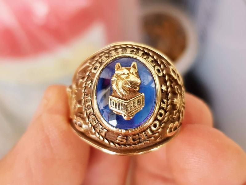 nhẫn mỹ vàng 10k năm 1968Trên cùng là hột màu xanh biển với bề mặt trơn bóng đáy thông sáng, chính giữa hột gắn logo trường là hình ảnh chó husky. Bao quanh hột là...