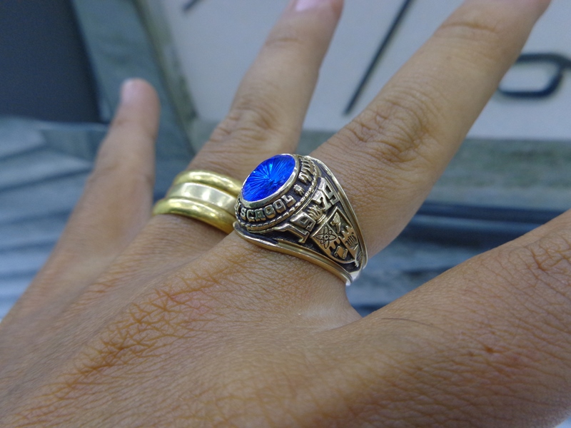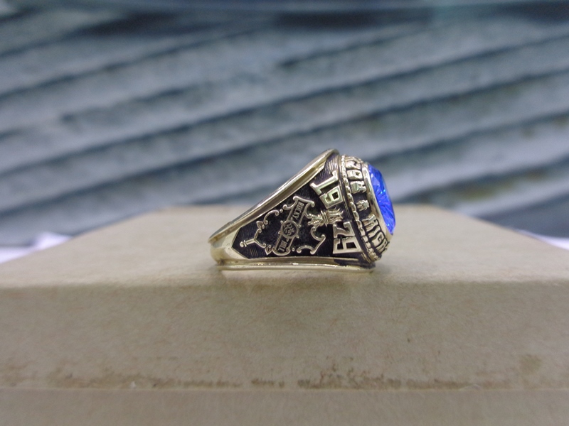 Nhẫn Mỹ Vàng 10K Năm 1979Trên cùng là hột màu xanh biển đáy tia , bề mặt mài đa giác , bao quanh hột bởi tên trường Rocky Hill High School- Bên hông phải là...