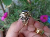 Nhẫn Mỹ Vàng 10K Năm 1969Trên cùng là hột màu tím Amethyst với bề mặt và đáy mài đa giác , bao quanh bởi tên trường Ansonia High School. Đáy hột 2DA cực hiếm gặp...