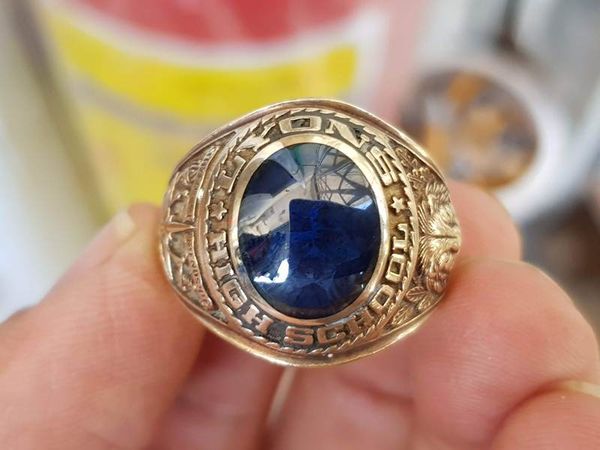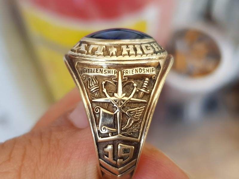 Trên cùng là hột trơn màu xanh đen có bề mặt láng, đáy vát cạnh, nhưng nhìn lòng trong thông đèn, kiểu hột 2 Da cực hiếm chỉ có ở những chiếc nhẫn vàng xưa, công nghệ này nay đã ko còn sản xuất nữa - đáy hột là lớp keo thông đc làm rất khéo bởi công nghệ xưa, bao quanh hột là tên trường Lyons High School.