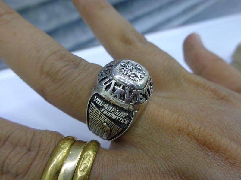 -Bên hông trái nhẫn là hình ảnh người cựu binh đứng bên bức tường tưởng niệm cùng với dòng chữ “You are not forgoten” (Bạn không bao giờ bị lãng quên).