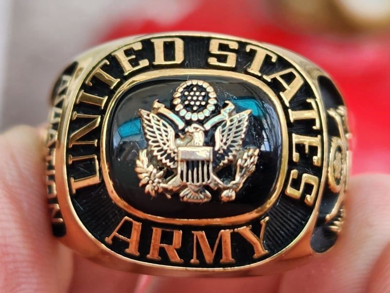 Trên cùng là hột đá đen BlackOxy láng bóng có gắn logo vàng đúc 10k cực dày hình đại bàng quốc huy Hoa Kỳ với 13 sao tượng trưng 13 bang của Hoa Kỳ lúc bấy giờ. Bao quanh hột là dòng chữ United States Army (lính bộ binh Hoa Kỳ)
