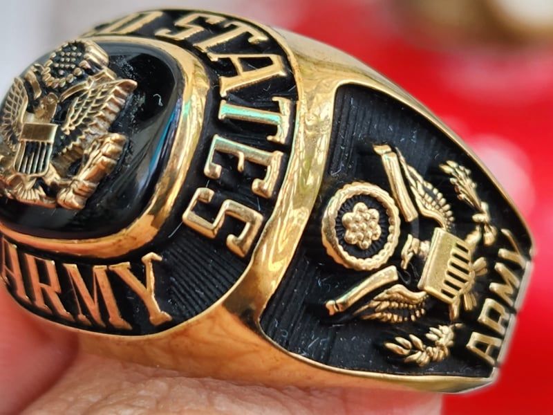 – Bên hông phải nhẫn khắc họa Logo Army Air force với cánh quạt máy bay kết hợp đôi cánh đại bàng xưa rất đặc trưng của lính bộ binh không quân thập niên cũ.
