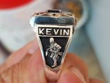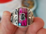 nhẫn mỹ xưa bạc hột đỏ tia- trên cùng là hột chữ nhật màu đỏ đa giác đáy tia cực kỳ độc đáo lấp lánh, chính giữa gắn logo trường chữ B, hai bên hông...