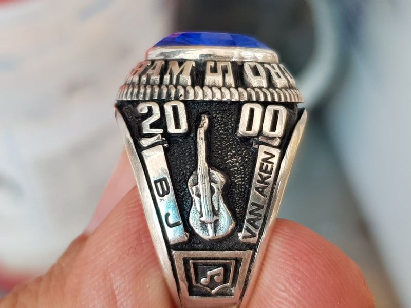 - bên hông trái nhẫn khắc họa hình ảnh người chơi thể thao môn chạy bộ siêu nét. khắc năm tốt nghiệp 2000 và chữ Matters X - Coutry.