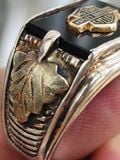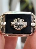 nhẫn mỹ xưa Harley Davidson vàng tam khí- Mặt nhẫn được thiết kế hoành tráng đẹp lạ với mặt đá đen BalckOxy đen tuyền chính giữa gắn logo Harley bằng vàng vàng, 2 bên hông...