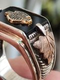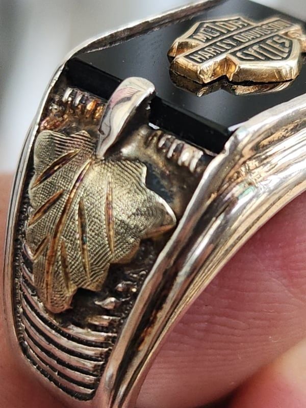 - Lòng nhẫn khắc mộc 925 và mộc triện hãng Harley Davidson (Bạc nguyên khối ốp vàng 12k đặc trưng của hãng Balck Hill Gold với 3 màu). Đây là công nghệ và ý tưởng độc quyền của công ty Black Hills Gold Jewelry ,người thiết kế là ông Henri LeBeau đến từ Pháp.