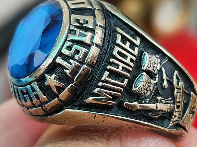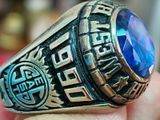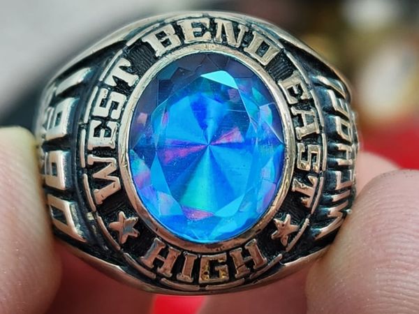 - Trên cùng là hột đá xanh màu Sapphire với bề mặt và đáy mài đa giác lấp lánh, đáy tia xoay 7 màu cực kỳ độc đáo rất sáng tài, bao quanh hột là tên trường West Beno East High School