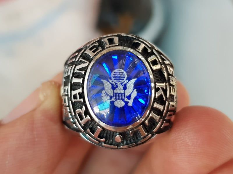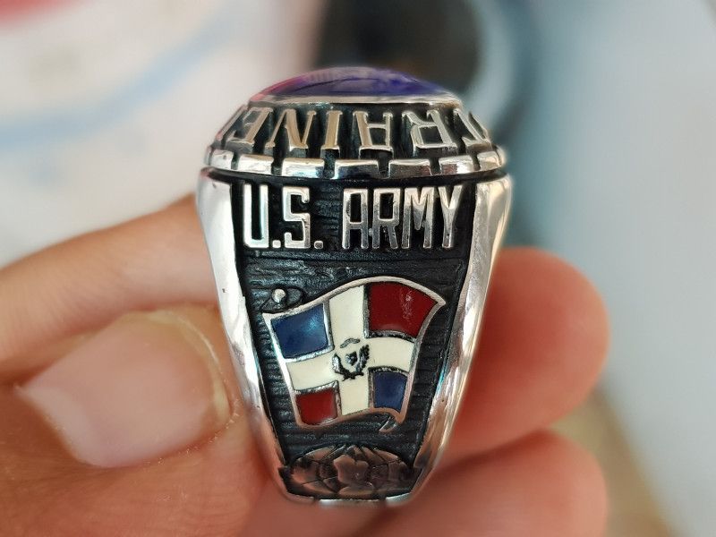 - bên hông trái nhẫn khắc họa hình ảnh lá cờ tung bay với men màu , phía trên là chữ US Army (bộ binh Hoa Kỳ)