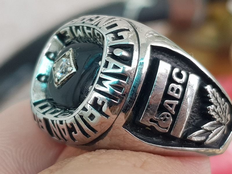 Trên cùng là hột đá đen BlackOxy tự nhiên trơn bóng, chính giữa hột là ổ kim hình thoi có đính viên xoàn CZ 2 ly, thiết kế chìm tạo cảm giác rất an toàn cho các bác hay chơi thể thao (chánh được va chạm cực tốt) . Bao quanh bởi dòng chữ American Bowling Congress