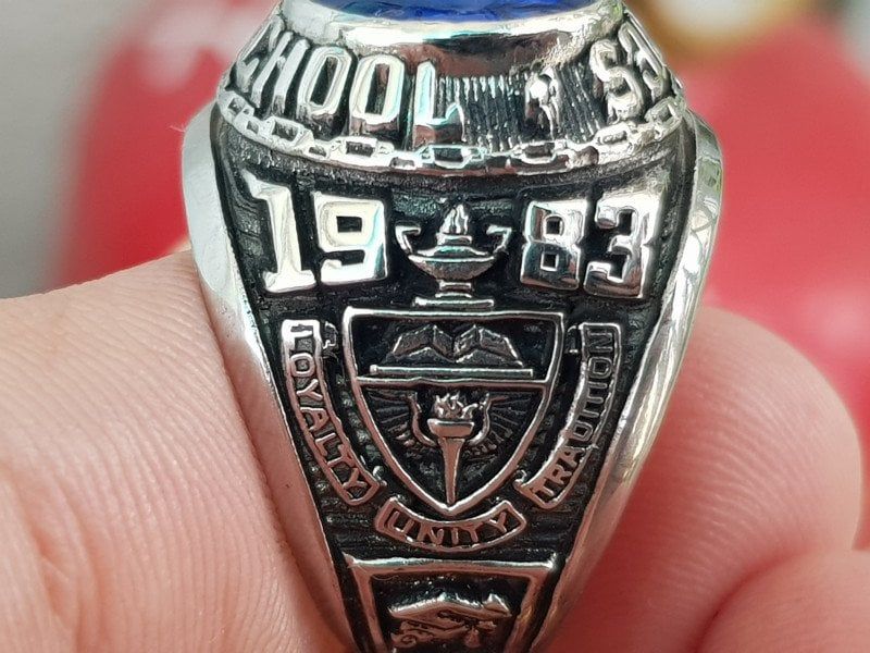- Bên hông phải nhẫn là hình ảnh logo trường với cây đèn, những dòng chữ nhỏ sắc nét và khắc năm tốt nghiệp 1983