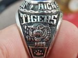 nhẫn mỹ xưa hợp kim hj hột xanh biểnTrên cùng là hột xanh sapphire có bề mặt láng và đáy mài đa giác lấp lánh , bao quanh hột là tên trường Joncs High School- Bên hông...