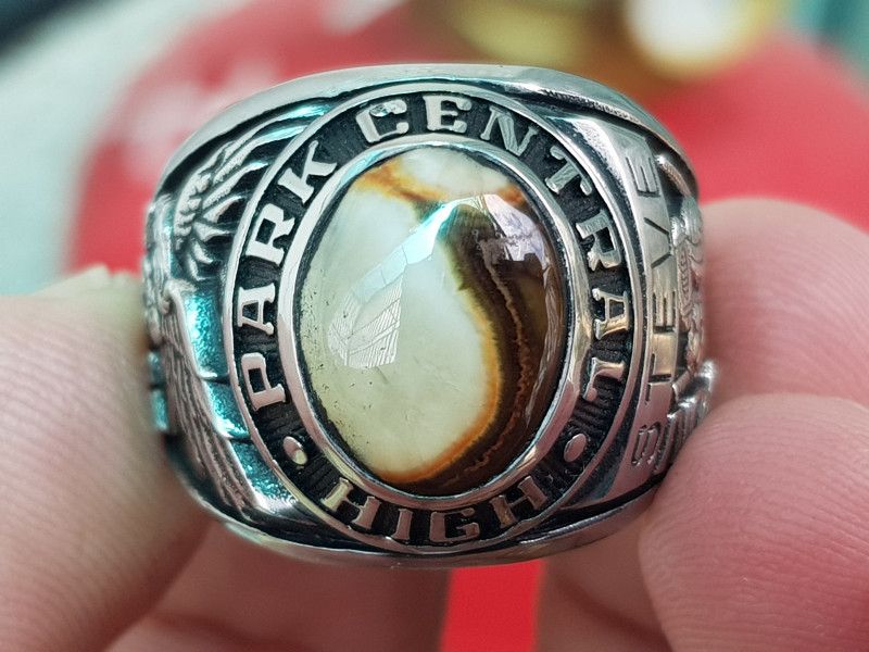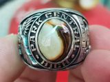nhẫn mỹ xưa hợp kim hột cẩm thạchTrên cùng là hột cẩm thạch trơn bóng với màu trắng pha nâu đất đá đang lên nước, bao quanh hột là tên trường Park Central High School- Bên hông...