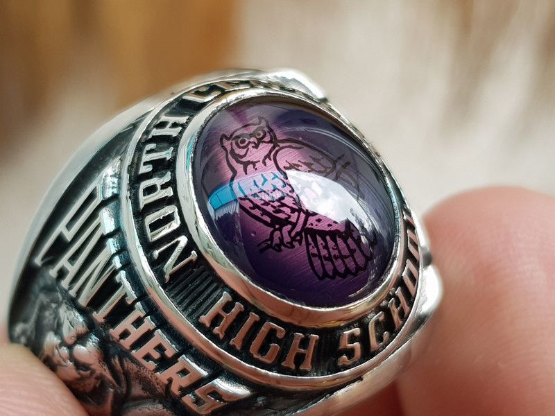nhẫn mỹ xưa hợp kim hột tím- trên cùng là hột màu tím Amethys tuyệt đẹp với bề mặt láng và đáy 3D hình chú chim sắc nét. bao quanh hột là tên trường North Central...