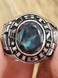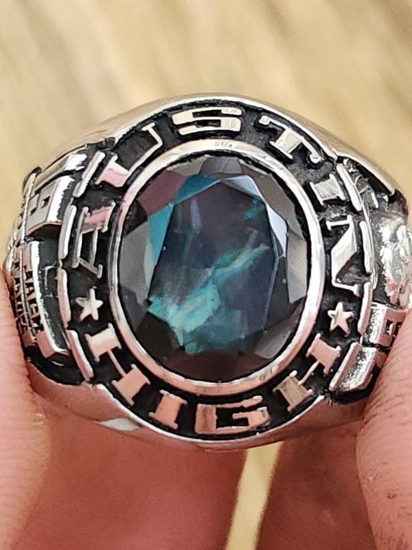 nhẫn mỹ xưa họp kim Jonsil platrium 1979– Trên cùng là hột xanh biển màu xanh khói đáy tia ẩn hiện tuyệt đẹp, mặt hột mài đa giác. Bao quanh hột là tên trường Austin High School-...