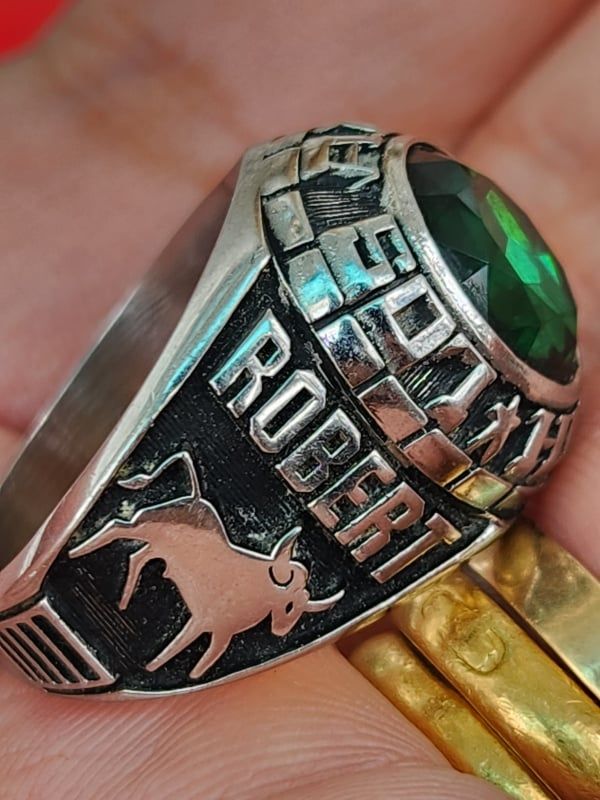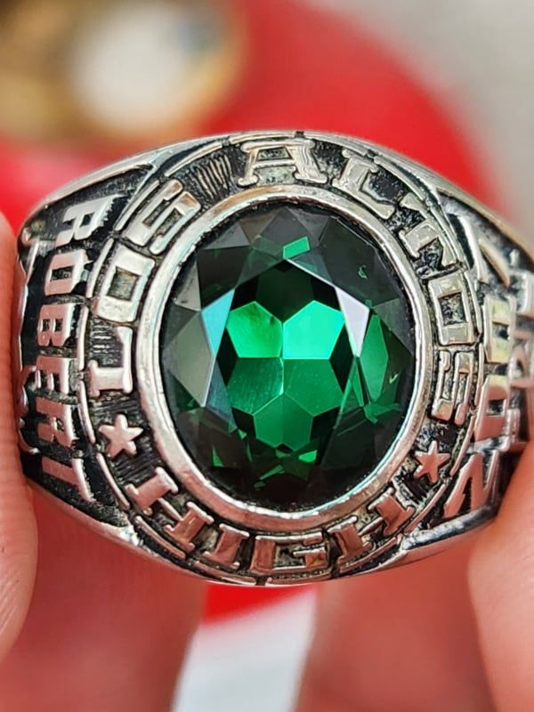 nhẫn mỹ xưa hợp kim Jostens ltm hột xanh lá- trên cùng là hột xanh lá màu Emerald với bề mặt và đáy mài đa giác lấp lánh. bao quanh hột là tên trường Los...