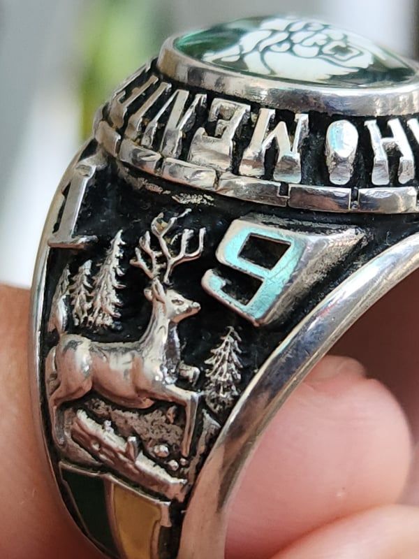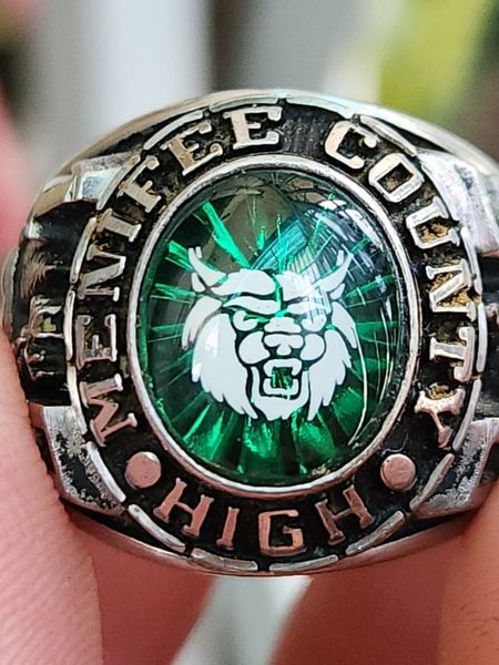 – Trên cùng là hột xanh lá màu Emeral đáy tia rực rỡ với bề mặt láng với đáy đa giác tia quang in chìm hình ảnh chú mèo rừng – lên tay đẹp không cưỡng nổi. Bao quanh hột là tên trường Menifee County High