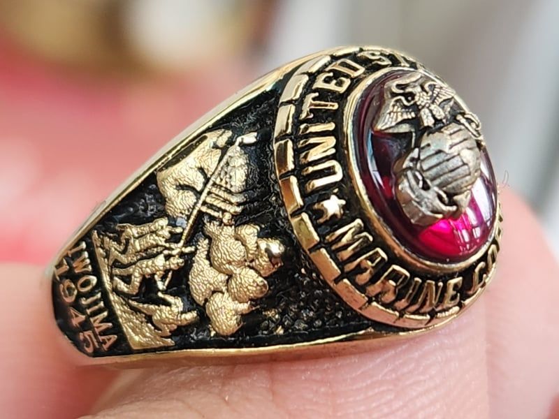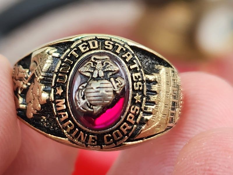 Trên cùng là hột đỏ màu Ruby láng đẹp gắn nổi logo của quân đoàn Thủy Quân Lục Chiến , bao quanh hột là dòng chữ United States Marine Corps