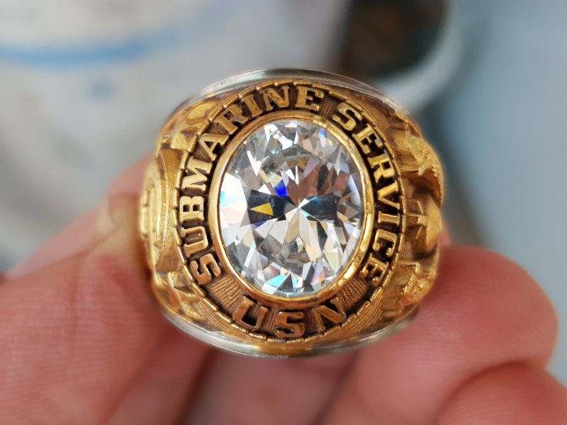 nhẫn mỹ xưa hợp kim Submarine- trên cùng là hột trắng tinh như viên xoàn CZ cực lớn 10*12mm lấp la lấp lánh như bông bưởi, bao quanh hột là dòng chữ Submarine Service USN...