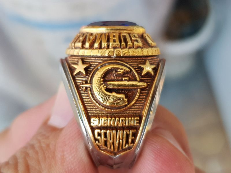- trên cùng là hột xanh biển màu Sapphire cực lớn 10*12mm lấp la lấp lánh như bông bưởi, bao quanh hột là dòng chữ Submarine Service USN (binh chủng tàu ngầm hải quân Hoa Kỳ)