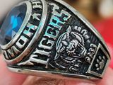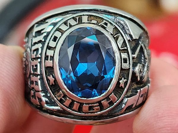 nhẫn mỹ xưa hợp kim tiger năm 1982Trên cùng là hột xanh lục lam sapphire có bề mặt và đáy mài đa giác lấp lánh , bao quanh hột là tên trường Howland High,- Bên hông phải...