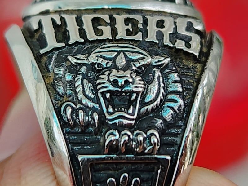 - Bên hông phải nhẫn là hình ảnh vận động viên bóng chày đang vung gậy, khắc năm tốt nghiệp 1983