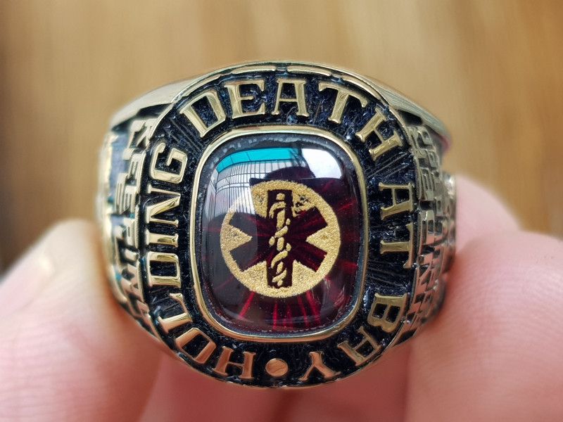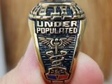 nhẫn mỹ xưa hợp kim xi vàng Balfour GTC- trên cùng là hột màu đỏ tia đậm với in chìm là logo của quân đoàn quân y hoa kỳ, bao quanh hột là dòng chữ...