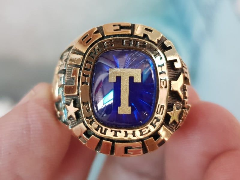 - trên cùng là hột xanh biển màu Saphire với đáy tia cực độc, đáy hột có chữ T, bao hột là tên trường Liberty High và được lồng thêm 1 vòng chữ Home of the Panthers làm cho bản nhẫn trở lên cực lớn 22mm lên tay thật hoành tráng.