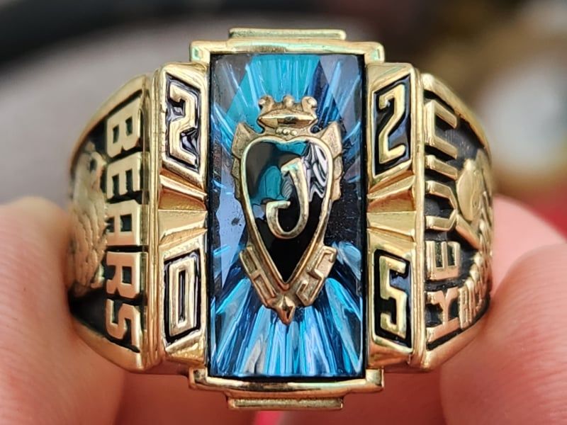 trên cùng là hột xanh biển đáy tia độc đáo, chính giữa hột có gắn Logo trường chữ J cực đẹp. hai bên thành nhẫn khắc năm tốt nghiệp 2025. (nhẫn thuộc hệ mẫu ký hợp đồng nên mới nguyên chưa hề đeo qua tay)