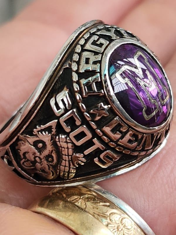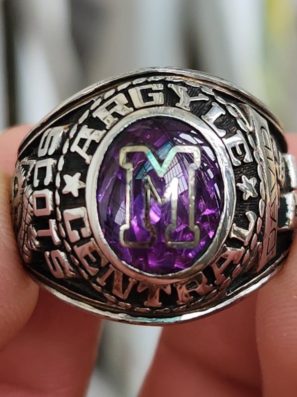 nhẫn mỹ xưa hột khảm chữ hãng Jostens- trên cùng là hột tím đá Amerthys tuyệt đẹp cho các bạn mệnh Hỏa, chính giữa hột được dát vàng chữ M, bao quanh hột là tên...