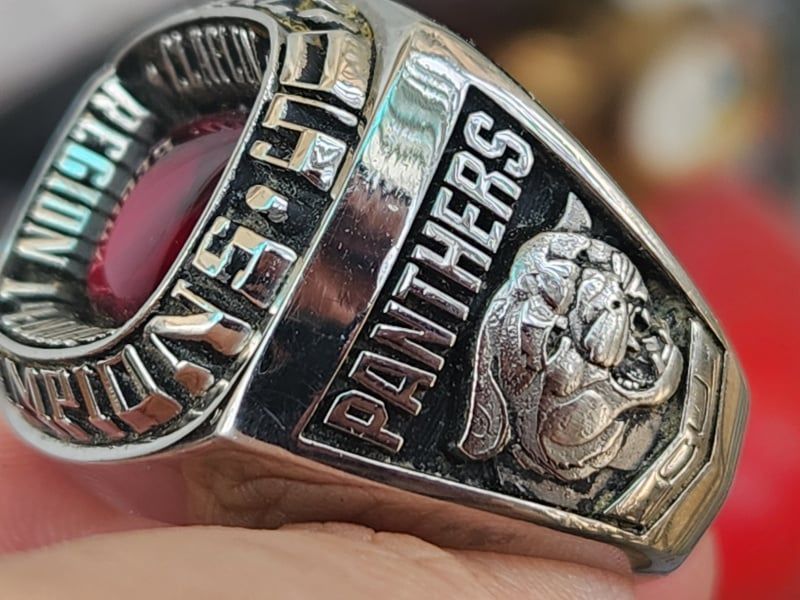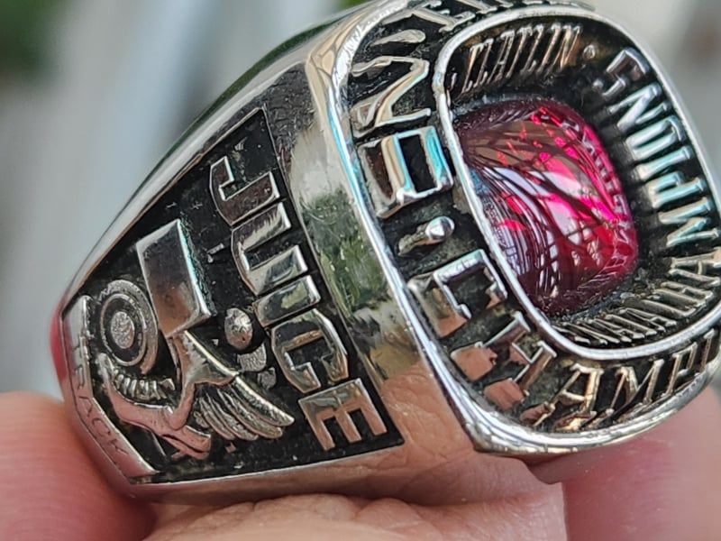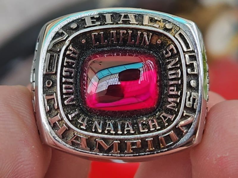 Trên cùng là hột đỏ màu Ruby với bề mặt trơn bóng, hạt lanh lấp lánh hắt ánh ruby huyền ảo, bao quanh bởi dòng chữ Region 14 Naia Champions Claflin. Khắc năm 2005