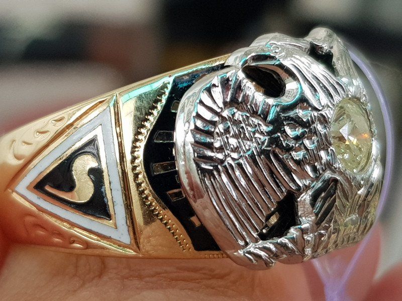 - Chủ đề Masonic (Hội Tam Điểm) với những dấu hiệu của Nghi lễ Scotland cổ xưa, chuẩn nhẫn Masonic xưa, chi tiết còn cực kỳ sắc sảo (đặc biệt là phần Đại bàng 2 đầu – nhìn như là platinum/palladium vậy, sáng trưng!). Nhẫn design vàng 2 màu (“demi”) rất đẹp, nặng 10gram ( hơn 2.66 chỉ vàng).