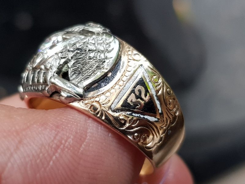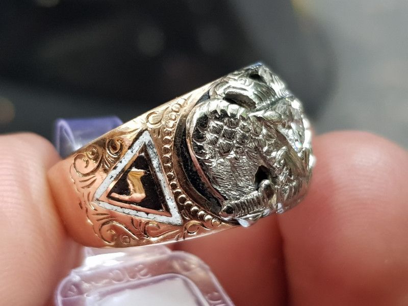- Chủ đề Masonic (Hội Tam Điểm) với những dấu hiệu của Nghi lễ Scotland cổ xưa, chuẩn nhẫn Masonic xưa, chi tiết còn cực kỳ sắc sảo (đặc biệt là phần Đại bàng 2 đầu – nhìn như là platinum/palladium vậy, sáng trưng!). Nhẫn design vàng 2 màu (“demi”) rất đẹp, nặng 8.42gr ( hơn 2.3 chỉ vàng).
