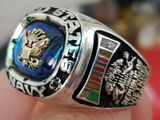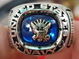 nhẫn mỹ xưa navy bạc xưa logo vàng 10kTrên cùng là hột xanh biển màu sapphire lung linh có gắn logo vàng 10k đại bàng quốc huy Hoa Kỳ. Bao quanh hột là dòng chữ United...