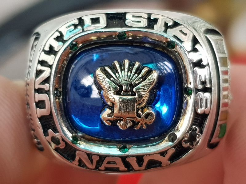 Trên cùng là hột xanh biển màu sapphire lung linh có gắn logo vàng 10k đại bàng quốc huy Hoa Kỳ. Bao quanh hột là dòng chữ United States Navy (lực lượng hải quân Hoa Kỳ) và 10 viên lục bảo lấp lánh.