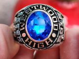 – Trên cùng là hột xanh biển màu Sapphire bề mặt và đáy mài đa giác đẹp lấp lánh ngất ngây, Bao quanh hột là dòng chữ tên trường Westwood High.