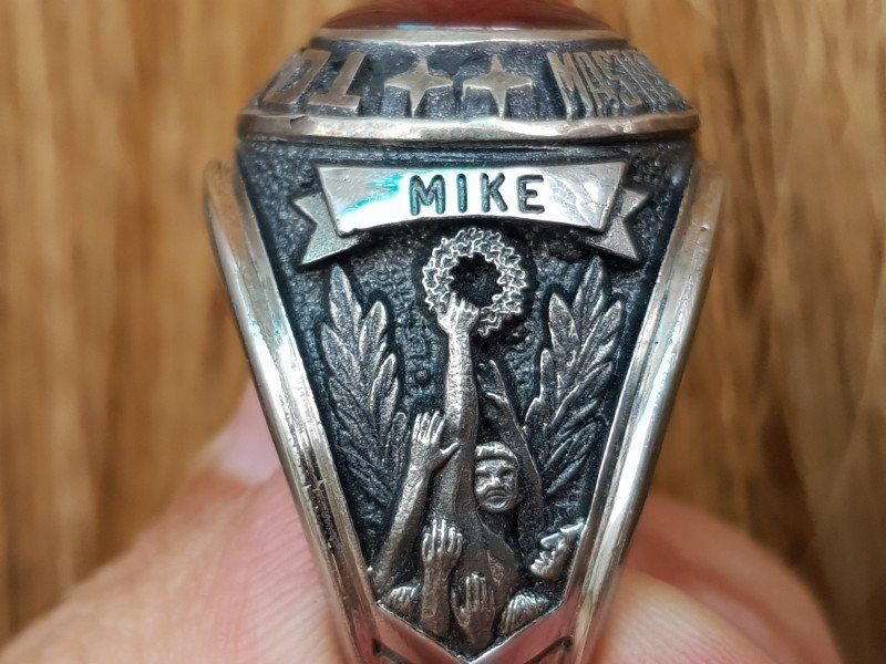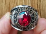 nhẫn mỹ xưa Toyota- trên cùng là hột đỏ màu booc đô tuyệt đẹp với bề mặt láng đáy giác, bao quanh hột là 4 sao với dòng chữ Toyota Master Technician (nhẫn vinh danh...