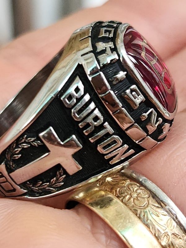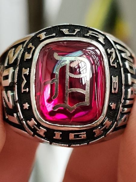 - trên cùng là hột đỏ màu Ruby bề mặt láng đáy đa giác lấp lánh, bề mặt hột được dát vàng chữ cái rất mượt mà. Bao quanh hột là tên trường Mulvane High.