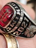 nhẫn mỹ xưa trường dòng công giáo hột đỏ dát vàng- trên cùng là hột đỏ màu Ruby bề mặt láng đáy đa giác lấp lánh, bề mặt hột được dát vàng chữ cái rất...