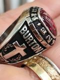 - bên hông phải nhẫn khắc họa hình ảnh cây Thánh Giá với vòng nguyệt quế bao quanh , trên khắc chữ Burton