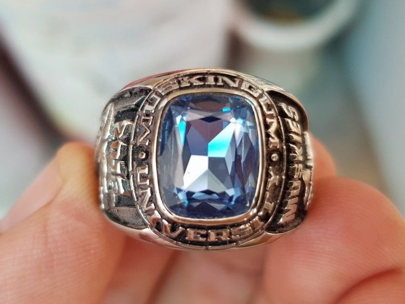 nhẫn mỹ xưa University hợp kim- trên cùng là hột xanh Aquamarine lấp lánh với bề mặt và đáy mài đa giác, bao quanh hột là tên trường University Muskingum.- bên hông trái nhẫn khắc...