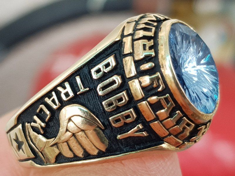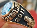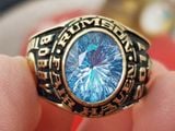 nhẫn mỹ xưa vàng 10k jostens hột tia- trên cùng là hột tia cực hiếm lung linh màu Aquamarine với bề mặt và đáy mài đa giác lấp lánh, bao quanh hột là tên trường...